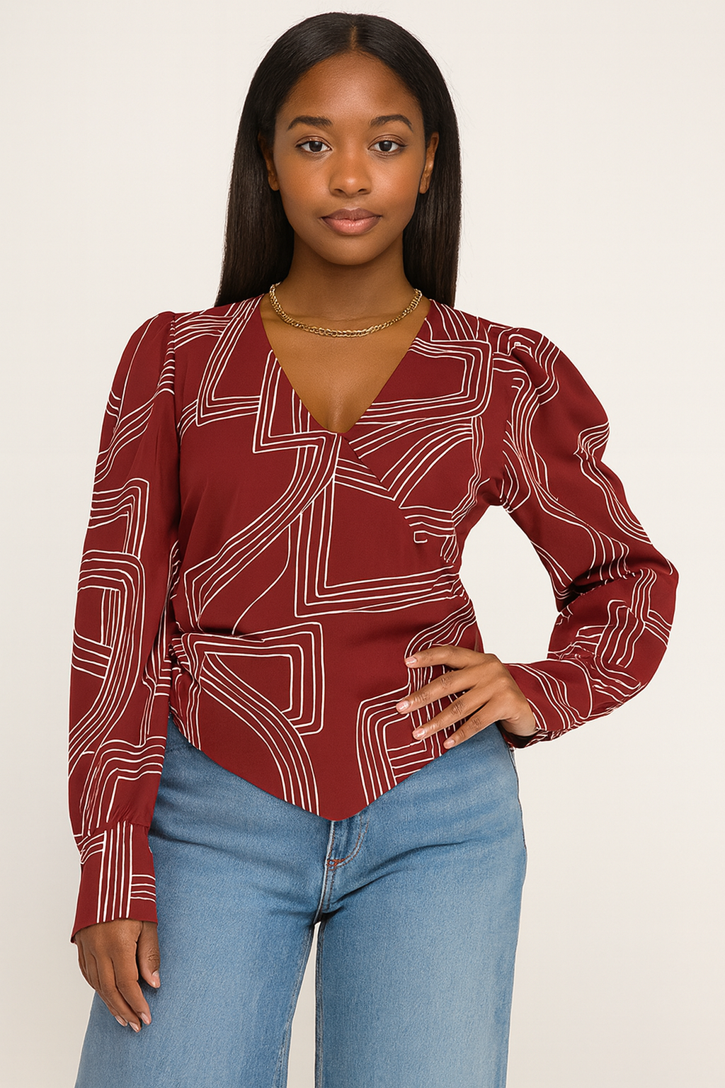 Abstract Long Sleeve Wrap Front Hanky Hem Top